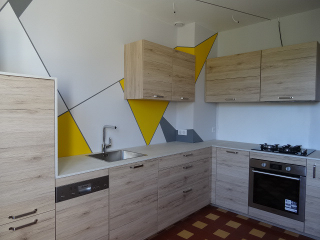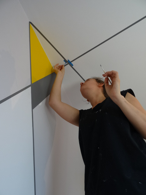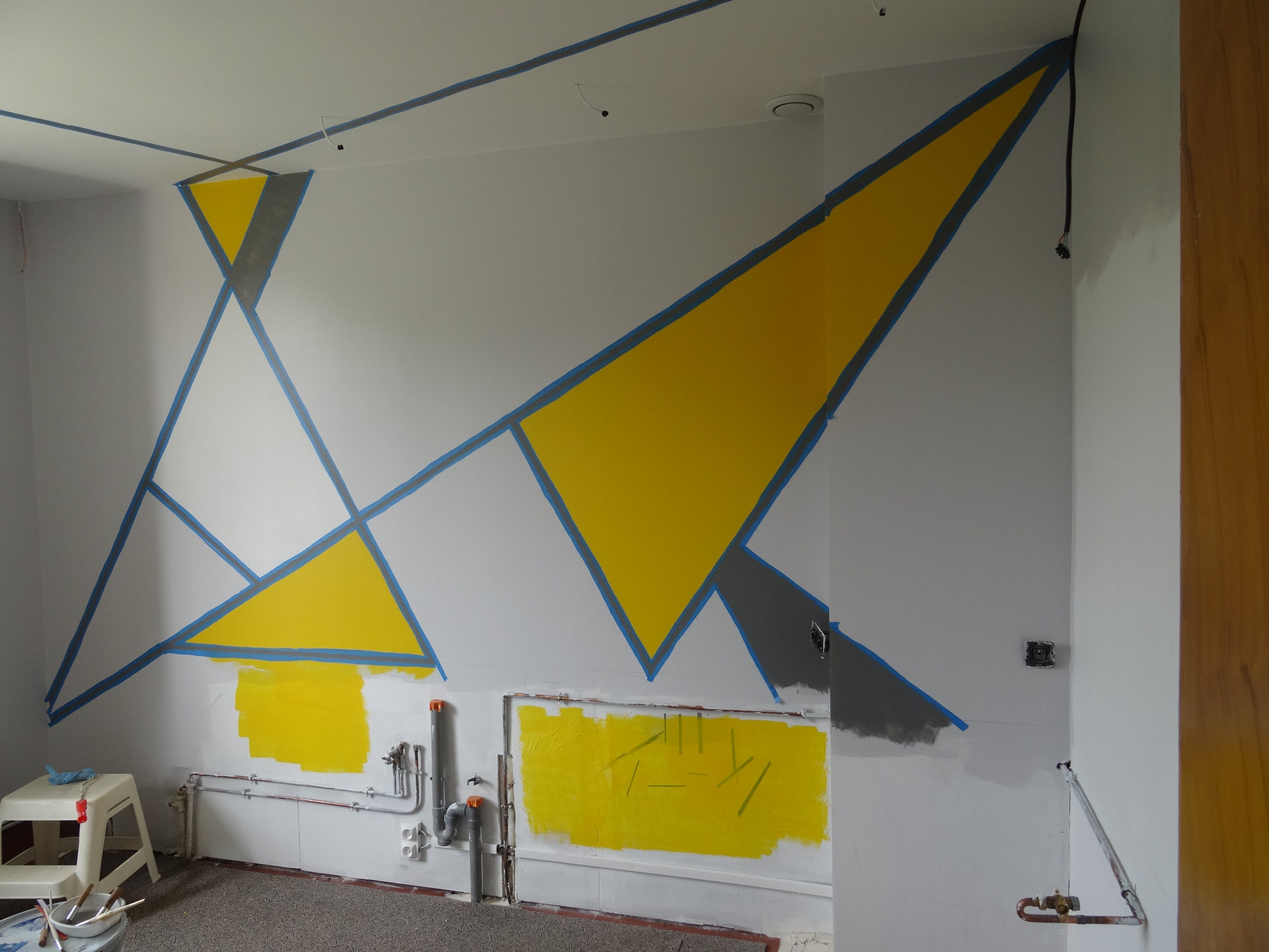 Création d'un décor géométrique sur murs et plafond avec une anamorphose pour une cuisine
